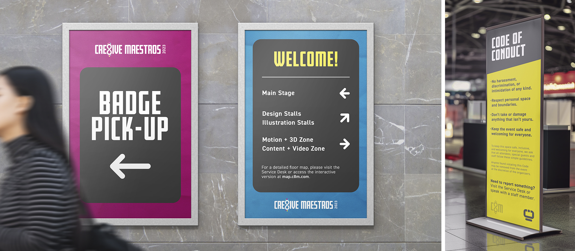 Even though the conference centres on digital creatives, I wanted to “ground” the brand in the physical environment using a CMYK colour palette and paper textures, acknowledging that many digital circles are rooted in print through merchandise, outdoor advertising, and the like. After all, the primary mission of the conference is to connect real creatives together.