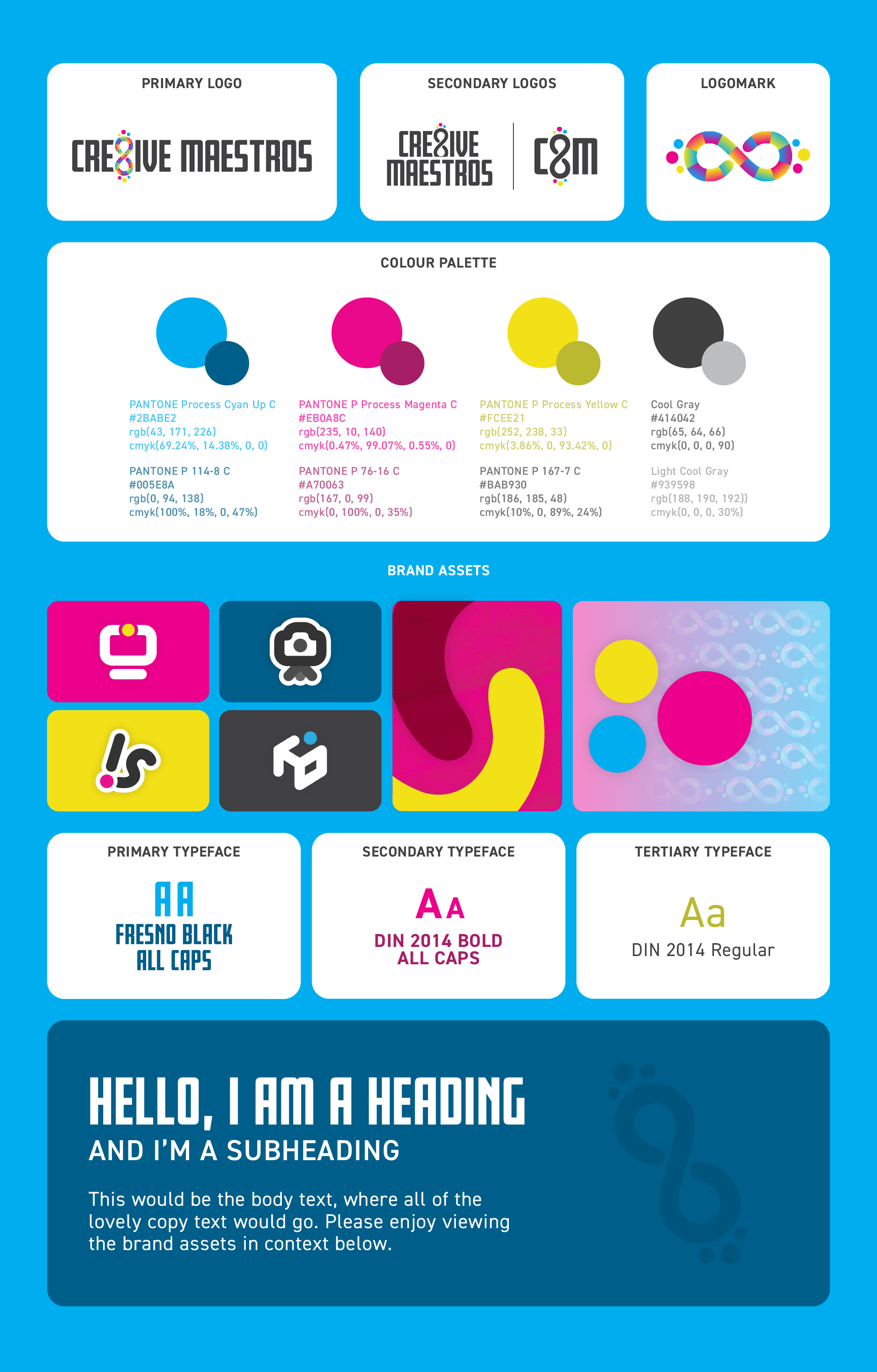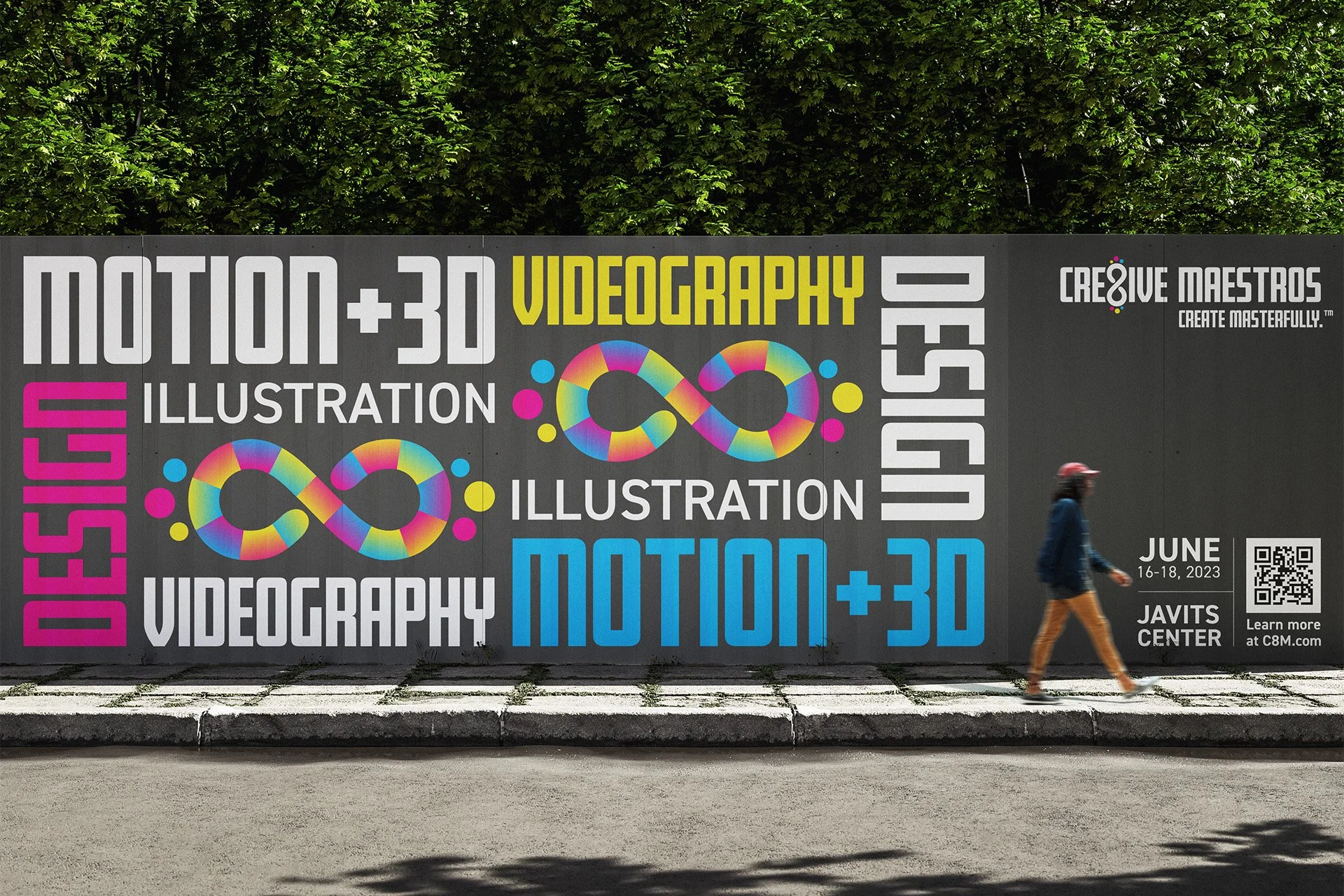 The logomark is the “8” in “Cre8ive Maestros,” depicted as an infinity loop. Conceptually, it reflects infinite creative possibilities, continuous learning, and the way different creative disciplines can intersect and inform one another. At conception, I wanted to suggest that the conference “historically” started with three disciplines before Content & Video was added with the rise of user-generated content. That would be why there are only three dots at the end of the loops instead of four.