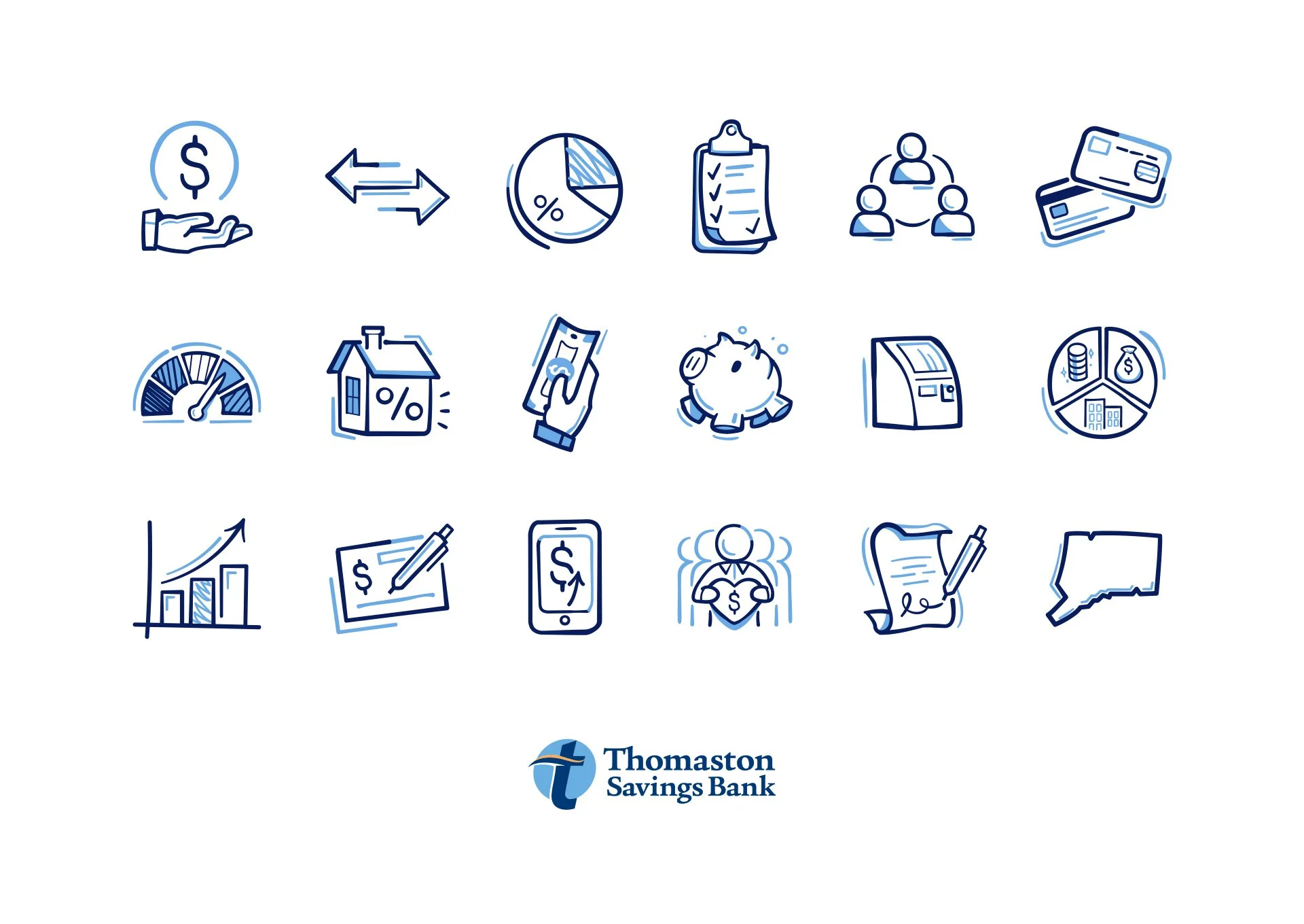 This project resulted in a hand-crafted and undeniably unique icon suite tailored for Thomaston Savings Bank's new illustrative branding. Over 120 icons were created, refined, and peer-to-peer reviewed to achieve a balance between charm and usability. Each icon tells a small story about the service it represents, and the suite turns simple symbols into recognisable assets of the brand's new voice.